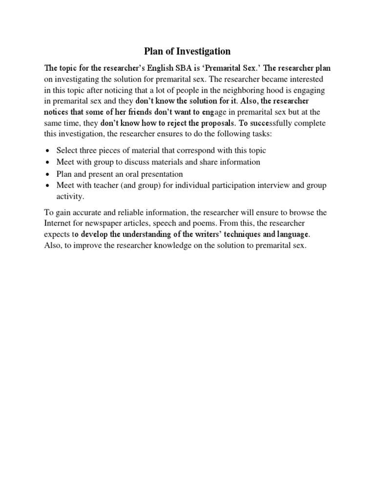 Example of a plan of investigation for english sba. Table of content Plan of investigation With the topic of my English sba school base Assignmet is prostitutionI became interested in this topic noticing how prostitution have a great role with. I will be investigating the causes and effects of poverty as well as the people who are most likely to be affected. Examples of possible sources may include.